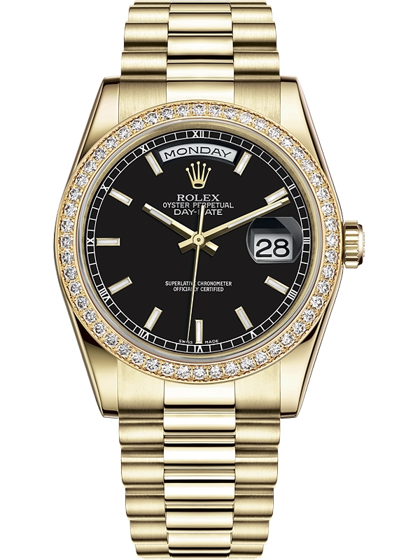 Rolex Day-Date 36 Yellow Gold Diamond Bezel Index Black Dial President Watch 118348