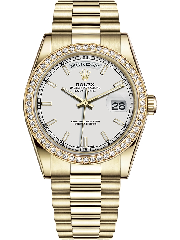 Rolex Day-Date 36 Yellow Gold Diamond Bezel Index White Dial President Watch 118348