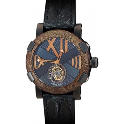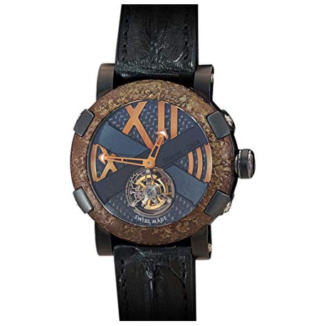 Other Features: Caliber, 1023RJ by BNB - Tourbillon. Limited Edition, 9 pieces. Jewels, 19 rubies. Rate frequency, 21600 vph. Power reserve, >120 hours. Bezel, stabilized ultimate rusted steel. Flank, black satin-finished steel. Paws, black mat ceramic with titanium screws. Lug, black satin-finished steel. Lug insert, black satin-finished steel. Crown, black steel with black rubber. Case Back, carbon fibre and sand-blasted plate and traverses. Water resistance, 5 atm. Strap, black rubber or crocodile hornback with black steel folding clasp