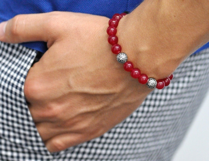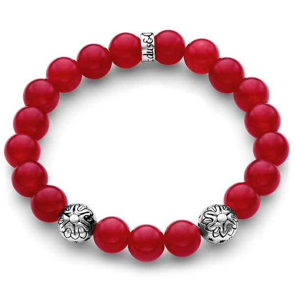 This bright gemstone bead bracelet is handcrafted by Edus&Co to perfectly fit men's or women's wrist. It features red jade beads of 8 mm set on durable stretch cord. The look is completed by two symbolic star beads artfully handmade of solid 925 sterling silver, and oxidized for original antique finish. All Edus&Co. bracelets come with an individual serial number engraved. Add this unique piece to your jewelry collection!