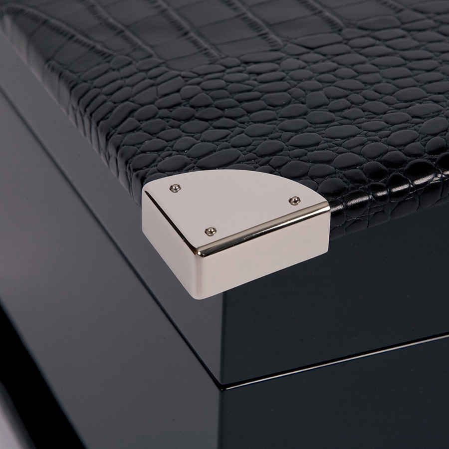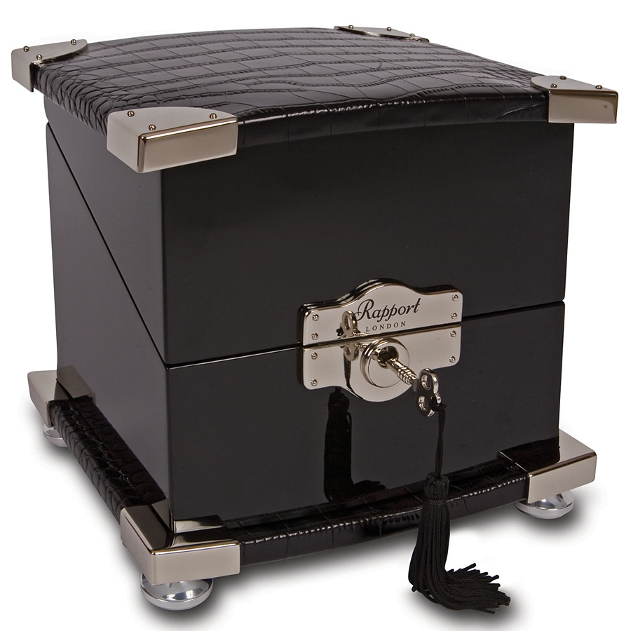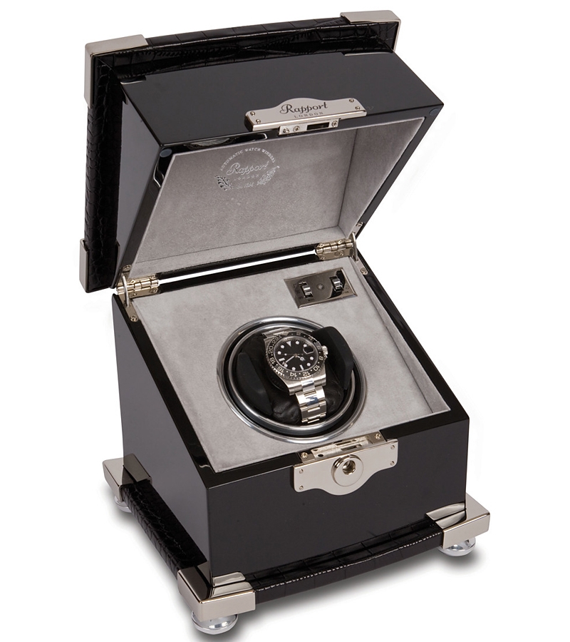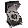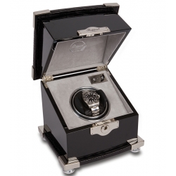 Give the very best feel to the most favorite automatic watch with this single watch winder W221 that comes from Optima Serpentine series produced by Rapport of London in United Kingdom. The box is ably crafted in fine ebony wood veneer with high-gloss lacquered finish. The top features genuine black leather embossed with crocodile effect. The lid is also accented chrome plated protective corners. There is a decorative escutcheon plate closure to safely lock your valuables. The interior is lined with soft-feel gray velvet material. The watch holder is covered with black leather, and has adjustable soft clip that accommodates any length of watch band. This device is equipped with a reliable motor that is completely programmable, and runs virtually silent. There are control switches that offer to select between 2 speed rotation options (3960 or 1130-1690 turns per day) and 3 rotation directions (clockwise, counter-clockwise or bi-directional). It's powered with AC adapter or batteries. The case measures 8 1/2 inches in width, 8 1/2 inches in height and 7 1/2 inches in depth. This winding machine is designed with a touch of pure luxury! We're an official dealer of the brand. You get factory warranty and free domestic shipping for this item.