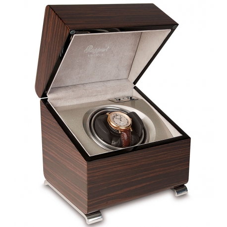 New look of Optima winding system is presented by this single watch winder W341, a member of Vogue collection created by Rapport of London. The box is masterly produced from solid wood with high-gloss lacquered Macassar finish. It features eight elegant rounded corners, and fitted with two chrome plated brass foot. The interior is lined with soft-feel gray velvet fabric. The watch holder is covered with black leather, and has adjustable soft clip that accommodates any length of watch band. This device is equipped with a reliable motor that is completely programmable and runs virtually silent. There are control switches that offer to select between 2 speed rotation options (3960 or 1130-1690 turns per day) and 3 rotation directions (clockwise, counter-clockwise or bi-directional). It's powered with AC adapter or optional batteries. The case measures 7.25 inches in width, 7.25 inches in height and 6.25 inches in depth. Luxurious solution for your one valuable timepiece! We're an official dealer of the brand. You get factory warranty and free domestic shipping for this item.