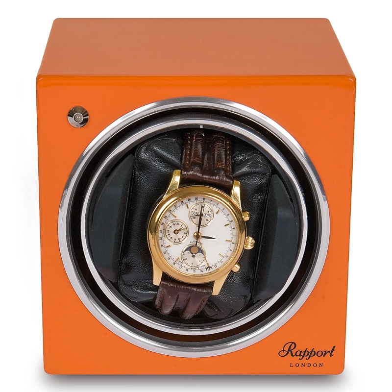 Add a bright detail to your furniture with orange single automatic watch winder EVO10 from new Evolution collection designed by Rapport of London. This is one of the most versatile units for winding 1 timepiece. Its case is made of wood finished with several lacquer layers of orange color. The watch holder is covered in black leather, and there are rubber clips on the sides. It is fully adjustable to fit any case diameter and band style. The cube is equipped with ultra quiet winding mechanism powered by a supplied AC adapter. If you prefer to place the winder in a safe, there is an optional battery compartment that fits 4 C-type batteries. LED light is provided to indicate that power is on, and/or battery life. You can find a rotating control knob on the back of the box. To maintain accurate time keeping, it offers 3 winding options - soft, medium, strong. All these allow to keep any automatic watch in prime condition. We are an official dealer of the brand. So you get factory warranty and free domestic shipping for this item.