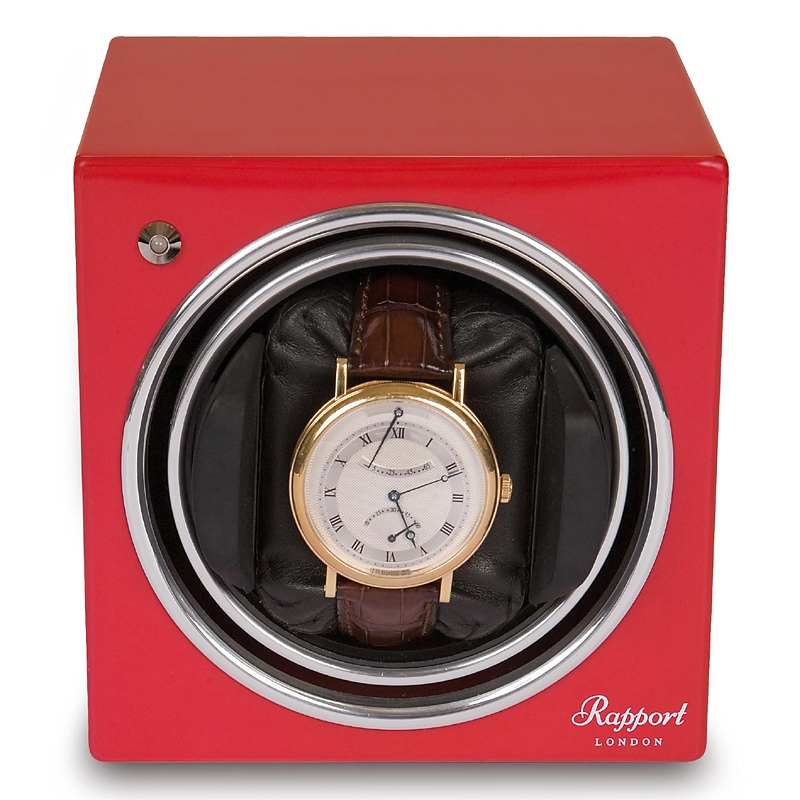 Match a color of your timepiece with red single automatic watch winder EVO6 from new Evolution collection designed by Rapport of London. This is one of the most versatile units for winding 1 timepiece. Its case is made of wood finished with several lacquer layers of red color. The watch holder is covered in black leather, and there are rubber clips on the sides. It is fully adjustable to fit any case diameter and band style. The cube is equipped with ultra quiet winding mechanism powered by a supplied AC adapter. If you prefer to place the winder in a safe, there is an optional battery compartment that fits 4 C-type batteries. LED light is provided to indicate that power is on, and/or battery life. You can find a rotating control knob on the back of the box. To maintain accurate time keeping, it offers 3 winding options - soft, medium, strong. All these allow to keep any automatic watch in prime condition. We are an official dealer of the brand. So you get factory warranty and free domestic shipping for this item.