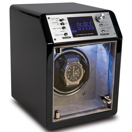 Smart winding choice with contemporary touch, this single automatic watch winder W631, a member of Cosmic series produced by Rapport of London. The box is ably created of solid ebony wood with high-gloss finish, and accented with chrome plated brass hardware. It's also fitted with a thick beveled glass door to observe your timepiece in a luxurious way. The interior is lined with soft gray velvet fabric, and illuminated with LED light. There is an LCD control panel that allows to select speed, duration and direction of rotations; quick-wind mode is available. The device is powered by AC adapter or C-type batteries. It measures 8.2 inches in height, 6.2 inches in width and 6.8 inches in depth. This winding machine won't let your mechanical watch stop! We're an official dealer of the brand. So you get factory warranty and free domestic shipping for this item.