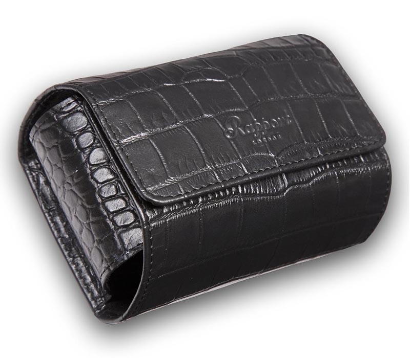 Our black single watch roll L116 is a part of Portman series produced by Rapport London. It is lovely crafted in genuine black leather embossed in a crocodile grain pattern with matching black stitch. It is also covered with black velveteen inside. Its soft interior guarantees secure and luxurious feel. There is a removable padded pillow that fits any case size, and holds it properly. The unit measures 4 1/3 inches in width, 3 1/2 inches in depth and 2 inches in height. This travel storage box is a fancy choice for watch enthusiasts! We are an official dealer of the brand. So you get factory warranty and free domestic shipping for this item.