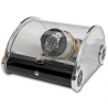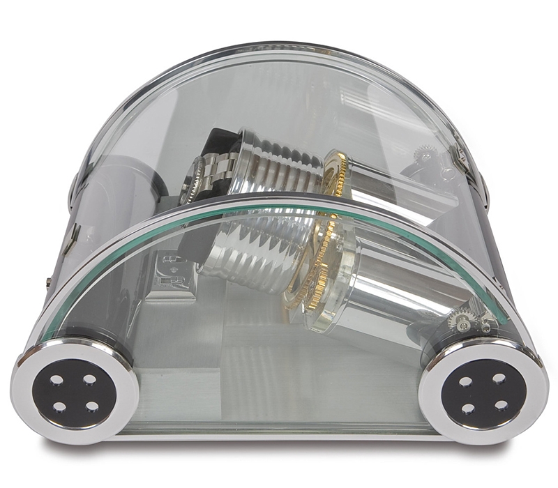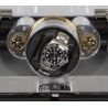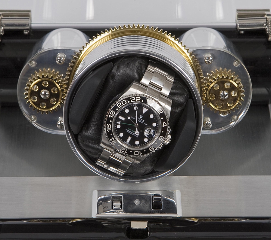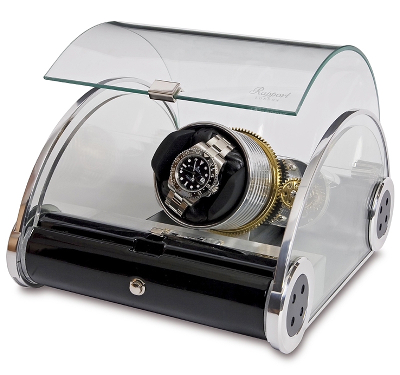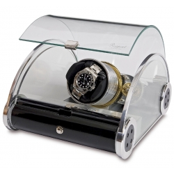 One of the most futuristic designs is presented by this single automatic watch winder W190, also known as Optima Time Arc created by Rapport of London. It has a semicircular case that artfully made of lead crystal glass with the edges trimmed with chrome plated steel. The base is also constructed from piano finish ebony wood. Original design allows to observe moving brass cog wheels. The watch holder is lined with black leather, and features an adjustable soft clip that accommodates any watch size. Winding mechanism works very quietly. It offers 2 speed rotation options (1130-1690 or 3960 turns per day) as well as 3 direction rotation modes (clockwise, counter-clockwise or bi-directional). This unit can be powered by AC adapter or batteries. We are an official dealer of the brand. So you get factory warranty and free domestic shipping for this item.