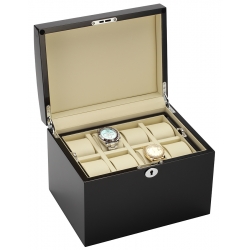Store your finest watches in this wooden storage box 34-725 designed by Diplomat Prestige. It has ultra-high gloss piano black wood finish exterior. The interior is lined with a luxurious cream leatherette. This case has two two trays that are capable of holding up to 16 watches. Those trays are removable, so the unit can also be used as a storage for other valuable items. Each compartment measures 50 mm in width and 75 mm in length. And there are sixteen soft cushions that can fit watches up to 50 mm in diameter. It can be locked using the supplied key. Use this Diplomat watch box to display your most valuable timepieces. We offers 1-year warranty for this product so you can rest assured that your purchase is protected against defects.
