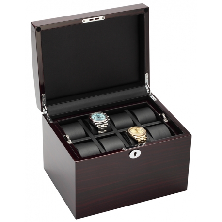 Store your finest watches in this wooden storage box 34-726 designed by Diplomat Prestige. It has ultra-high gloss piano ebony wood finish exterior. The interior is lined with a luxurious black leatherette. This case has two two trays that are capable of holding up to 16 watches. Those trays are removable, so the unit can also be used as a storage for other valuable items. Each compartment measures 50 mm in width and 75 mm in length. And there are sixteen soft cushions that can fit watches up to 50 mm in diameter. It can be locked using the supplied key. Use this Diplomat watch box to display your most valuable timepieces. We offers 1-year warranty for this product so you can rest assured that your purchase is protected against defects.