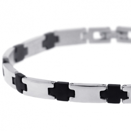 Wear this breathtaking men's wrist bracelet to give your look minimalist appearance! It is masterly produced from durable stainless steel that contrasts with black rubber link. It measures 6 mm in width, 8.5 inches in length, and closed with jewelry clasp. Our link bracelet is a handsome complement to your style!