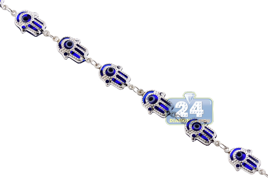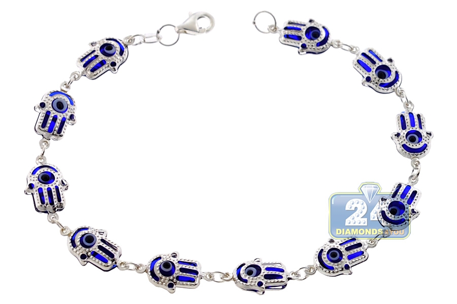 Sterling Silver Blue Hamsa Hand Womens Bracelet 8 mm 7 1/2 inches