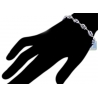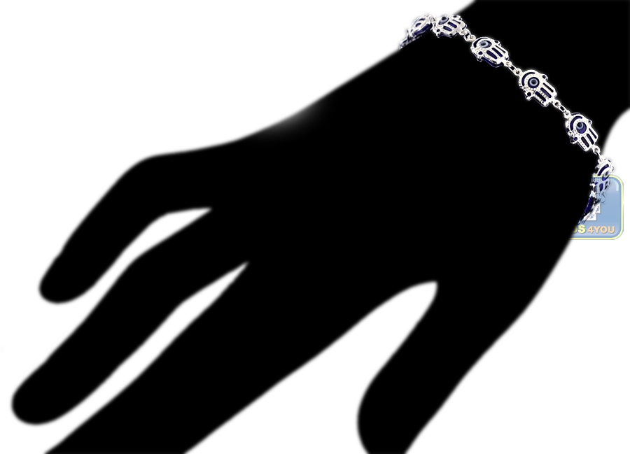 Out affordable evil eye bracelet wraps lady's wrist with versatile protection! Featured Hamsa Hand shaped links, it is ably produced from 925 sterling silver, and covered with white rhodium. It measures 7 1/2 inches in length 8 mm in width, and also secured with lobster claw clasp. This silver bracelet is perfect for a woman with classic sense of style!