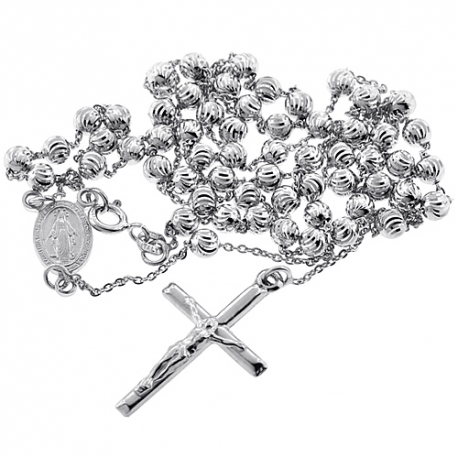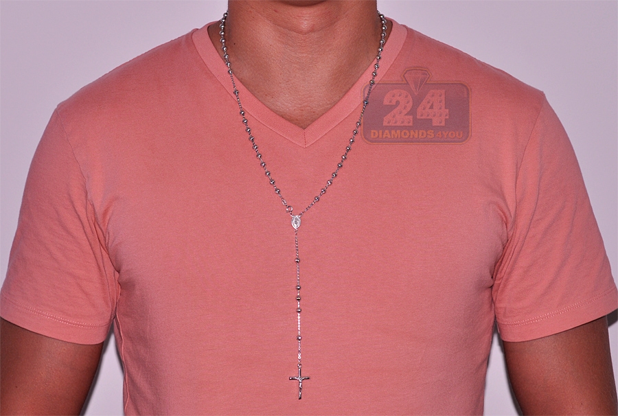Our men's rosary necklace, designed with moon cut beads, is filled with so much meaning! It's professionally made of Italian 925 sterling silver, and polished to have a very smooth shimmering look. It's also covered with bright white rhodium that prevents tarnishing. Beads of this rosary necklace measures 4 mm in width, and it's available in length of 24 or 26 inches with dangling part of 6 inches. Our religious necklace for men is a handsome reminder to wear every day!