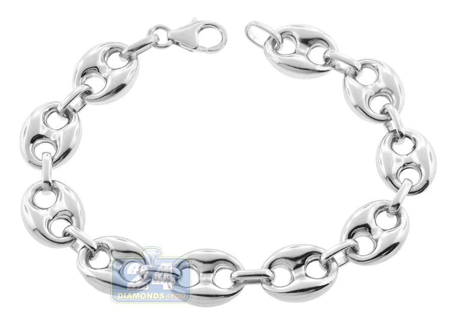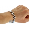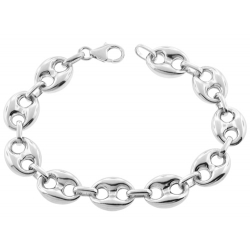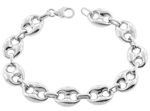 Our large puffed link bracelet wraps men's wrist in luxurious way! It's gorgeously handcrafted in Italian 925 sterling silver, highly polished for smooth finish, and covered with white rhodium to prevent tarnishing and to give shiny white color! The piece of jewelry measures 14 mm in width, 5 mm in thickness and 9 1/4 inches in length. It is also secured with user-friendly and the safest lobster claw closure. Make an unforgettable statement wearing this silver bracelet!