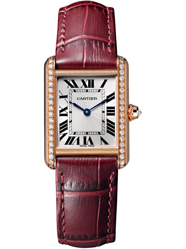 Tank Louis Cartier Small Model Diamond 18K Pink Gold Case Burgundy Alligator Leather Strap Women's Watch - Reference WJTA0010
