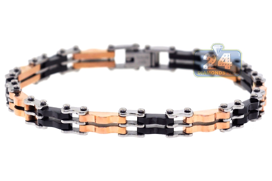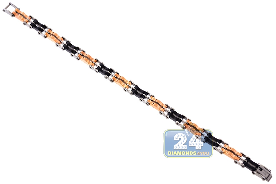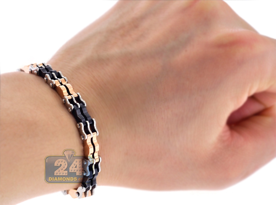 He will never want to take our impressive wrist bracelet off! Designed in popular bicycle style, it is ably made of stainless steel that highly polished, and partially covered with rose gold plating as well as black rhodium. The piece of jewelry measures 8 mm in width, 8 1/4 inches in length, and secured with jewelry clasp. Make a stylish statement wearing this men's bicycle link bracelet!