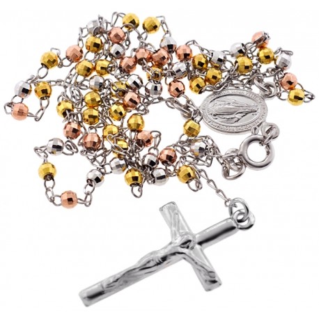 Our gorgeous three-color rosary necklace will suit your sophisticated style! It is masterly made of italian 925 sterling silver, and covered with white rhodium, yellow and rose gold plating; all that help prevent tarnishing and give a bright color. Amazing diamond cut design also makes this rosary sparkle a lot! The piece of jewelry measures 24 inches in length (not including a dangling part) and 3 mm beads. This religious necklace is a timeless accessory that looks unique anytime!