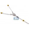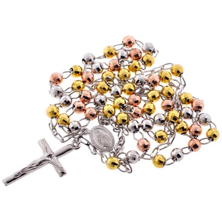 Make a statement of faith and fashion wearing our durable three-color rosary necklace! It is masterly made of italian 925 sterling silver, and covered with white rhodium, yellow and rose gold plating; all that help prevent tarnishing and give a bright color. Amazing diamond cut design also makes this rosary sparkle a lot! The piece of jewelry measures 26 inches in length (not including a dangling part) and 5 mm beads. This religious necklace is a timeless accessory that looks unique anytime!