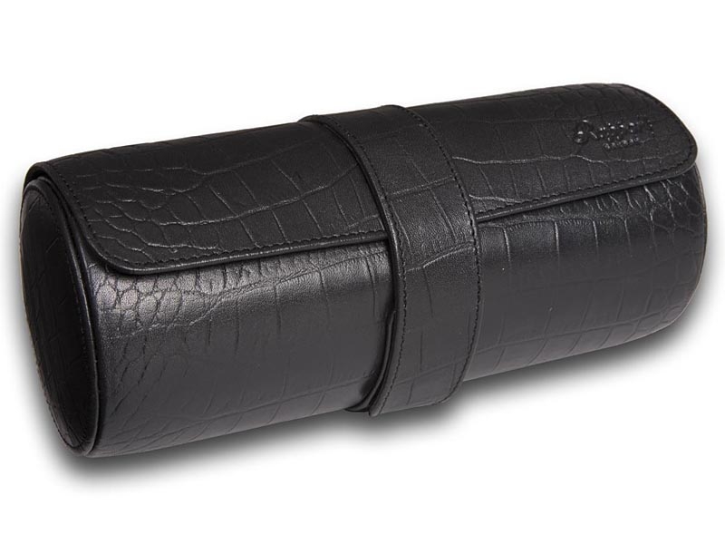 Going on vacation?! Take your treasured timepieces in this black triple watch roll L108, a part of Portman series designed by Rapport London. It is artfully created from fine black leather embossed in crocodile grains with black stitched edges, and lined with black velveteen inside. Soft interior prevents the watches from damage. There is a removable padded pillow roll that accommodates up to 3 watches of any case diameter. The storage unit measures 7 3/4 inches in width, 3 1/5 inches in depth and 3 1/5 inches in height. If you're looking for high-quality craftsmanship, this travel box is a perfect find! We are an official dealer of the brand. So you get factory warranty and free domestic shipping for this item.