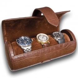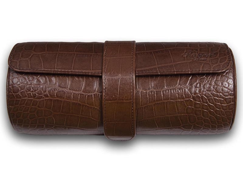 Going on holiday?! Wrap your pricey timepieces in this brown triple watch roll L109, a member of Portman collection designed by Rapport London. It is ably crafted in fine brown leather embossed in crocodile grains with brown stitched edges, and lined with brown velveteen inside. Soft interior prevents the watches from damage. There is a removable padded pillow roll that accommodates up to 3 watches of any case diameter. The storage unit measures 7 3/4 inches in width, 3 1/5 inches in depth and 3 1/5 inches in height. If you enjoy craftsmanship of the highest quality, choose this luxurious travel box! We are an official dealer of the brand. So you get factory warranty and free domestic shipping for this item.
