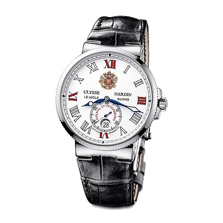 Additional Info: The Imperial St. Petersburg In the Egg of the Tsars. Maxi Marine Chronometer Enamel, Limited Edition: Ulysse Nardin has produced a Limited Edition timepiece – The Imperial St. Petersburg. This timepiece from the Ulysse Nardin Marine Collection features a genuine hand-crafted oven-cured enamel dial, with an applied gold double-headed Eagle which is emblematic of St. Petersburg. The Maxi Marine Chronometer is available in a Limited Edition of 30 pieces in platinum. The exhibition case back reveals a spectacular movement equipped with a 22 ct gold rotor. The officially certified self-winding movement (C.O.S.C) features the legendary oversized small seconds register and a large date display at 6. Each elegant 43 mm case is individually numbered and equipped with screw-crown and sapphire crystals. Water-resistant to 200 meters. The Imperial St. Petersburg is presented in an elaborate multi-layer white translucent enamel Egg of the Tsars decorated with 4.25 carats of diamonds. The diamonds have been applied in order to recreate legendary symbols of St. Petersburg. The Admiralty Spire, the Rostral Columns, the Arches of the General Staff Building and the famous drawbridges that open at night to allow for passage of large vessels can all be seen picked-out in diamonds. Ulysse Nardin's anchor serves to link the egg to the white marble base. Both the Imperial St. Petersburg and its accompanying Egg of the Tsars are destined to become highly sought-after by collectors.