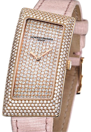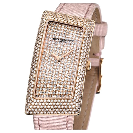 Ladies Vacheron Constantin 1972 Grand Curved watch, asymmetrically shaped 18kt rose gold case set with 333 round brilliant diamonds, pink fabric band, dial completely pave set with diamonds, 1202 Caliber quartz movement, scratch-resistant sapphire crystal, water-resistant to 30 meters. (Diamond total weight - 3.93ct).