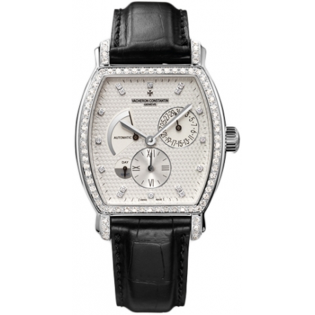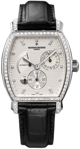 Dial Color: Silvered Guilloche textured dial with applied diamonds hour markers. Second Time-Zone sub-dial with a Day/Night Indicator at the 6 o'clock position. Date Sub-Dial at 3