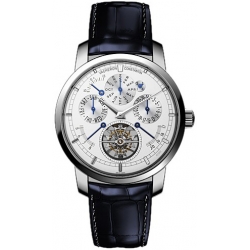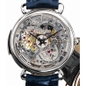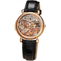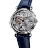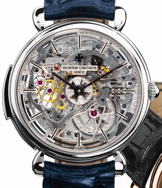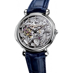 Men's Vacheron Constantin Patrimony Skeleton Minute Repeater watch, numbered limited edition, platinum case (37mm diameter, 8.2mm thickness) with transparent sapphire crystal case front and back, dark blue alligator leather strap with platinum tang buckle, 30 jewel 1755SQ Caliber skeleton manual-winding mechanism with chiming minute repeater.