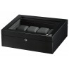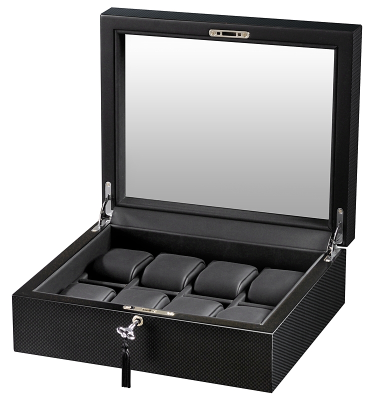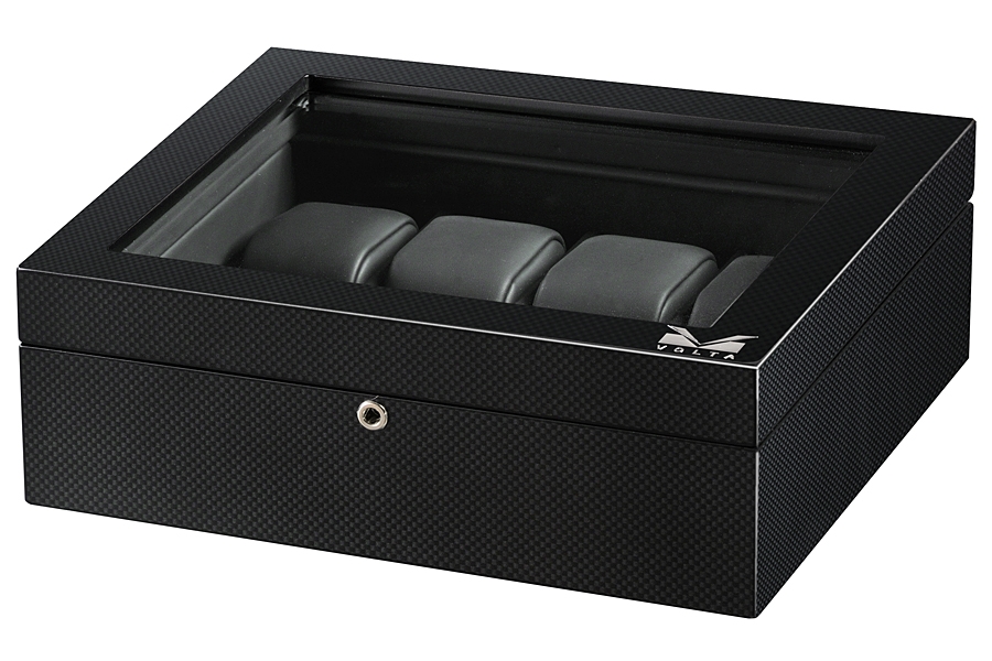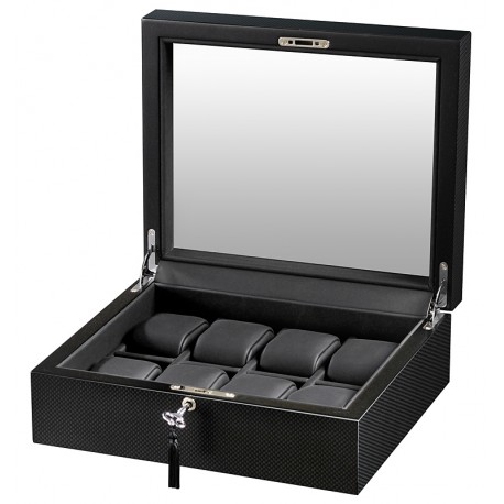 This Volta eight watch case 31-560920 features carbon fiber finish and a rich black leather interior. With this watch case, you will be able to store 8 of your finest timepieces. The watch case also features a see through glass window with beautifully showcases the watches inside. The watch portion of the watch case can also be locked using the supplied key which will ensure that your expensive timepieces are safe and secure.