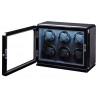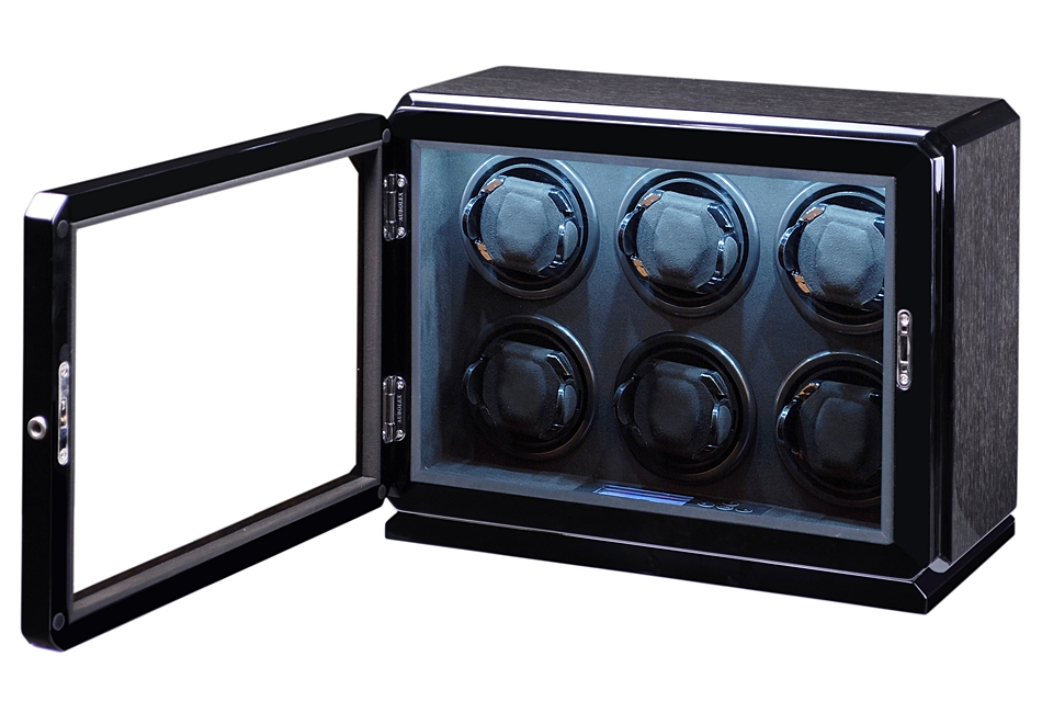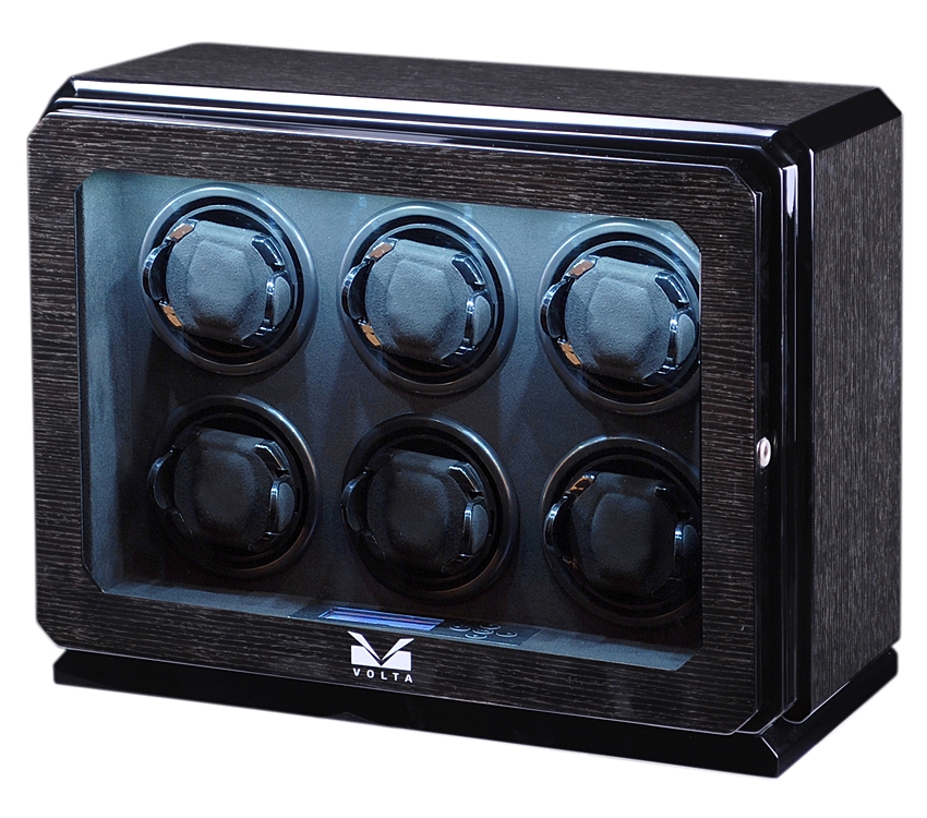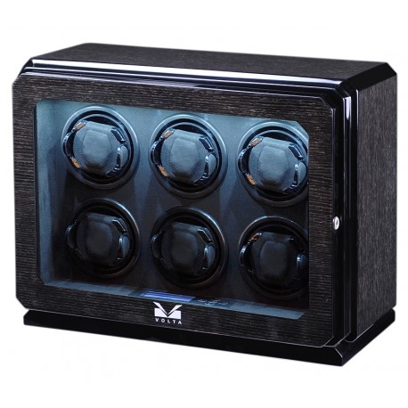 This Volta six watch winder 31-570060 features a high gloss black oak finish with an ultra-soft gray microfiber suede interior. The inside portion of this winder is lit by 6 white LED lights that beautifully showcases the watch that is mounted onto the winder. This winder can be locked using the supplied key to ensure the safety of your prized possessions. Each of the watch mounts is powered by its own high quality and ultra-quiet Japanese Mabuchi motor with a beltless construction which will allow you to use your winder for many years. To control the motors of the winder, you will find an LCD screen on the inside of the winder. Using the buttons to the right of the screen, you can control the revolution direction and the speed (TPD) of the winder. You are able to select a clockwise setting, a counterclockwise setting, or a combination of clockwise and counterclockwise revolutions. With this Volta winder, you are able to select a speed (TPD) setting of 650, 900, 1350, or 1800 revolutions, so you will definitely be able to find the right setting for your specific watch. This Volta winder features speed winding and sleep mode options. The speed winding options is available for those instances when your watch has completely died and you need to repower it. The sleep mode option allows you to mimic normal day to day wear as the winder will not work for a period of up to 16 hours per day.