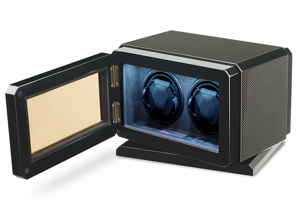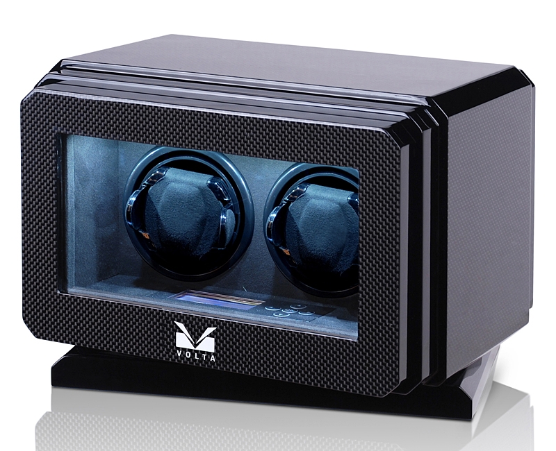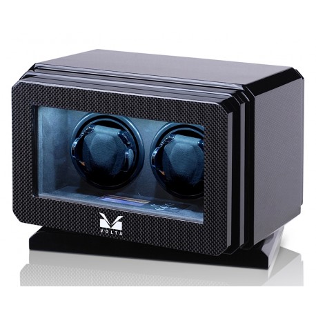 This Volta double watch winder 31-570021 features a high gloss carbon fiber finish with an ultra-soft gray microfiber suede interior. The inside portion of this winder is lit by 4 white LED lights that beautifully showcases the watch that is mounted onto the winder. The winder sits on a ball bearing base that allows the winder to rotate 360 degrees with ease. This winder can be locked using the supplied key to ensure the safety of your prized possessions. Each of the watch mounts is powered by its own high quality and ultra-quiet Japanese Mabuchi motor with a beltless construction which will allow you to use your winder for many years. To control the motors of the winder, you will find an LCD screen on the inside of the winder. Using the buttons to the right of the screen, you can control the revolution direction and the speed (TPD) of the winder. You are able to select a clockwise setting, a counterclockwise setting, or a combination of clockwise and counterclockwise revolutions. With this Volta winder, you are able to select a speed (TPD) setting of 650, 900, 1350, or 1800 revolutions, so you will definitely be able to find the right setting for your specific watch. This Volta winder features speed winding and sleep mode options. The speed winding options is available for those instances when your watch has completely died and you need to repower it. The sleep mode option allows you to mimic normal day to day wear as the winder will not work for a period of up to 16 hours per day. Please check other double watch winders.