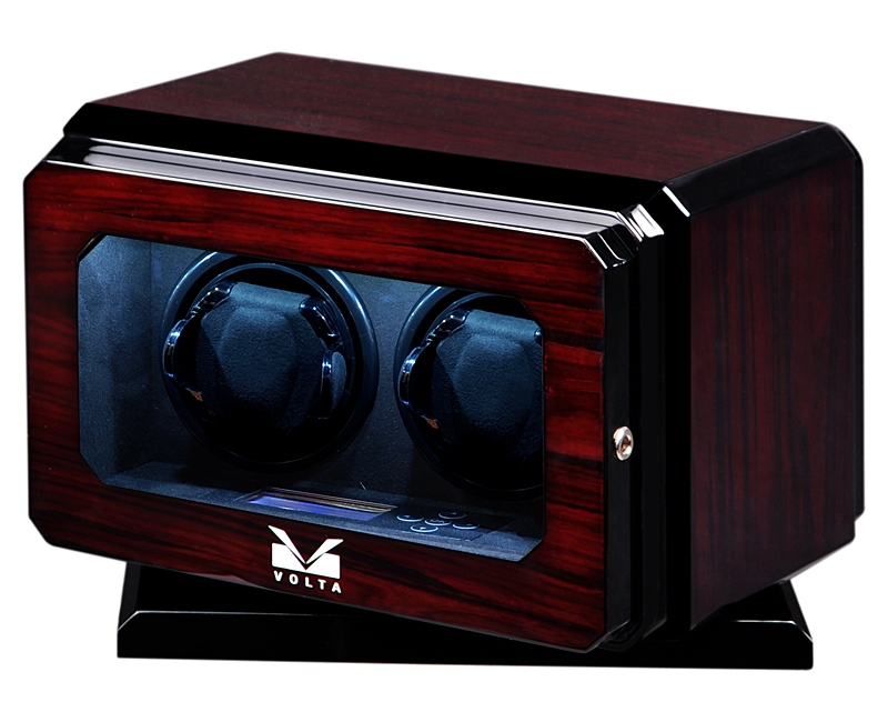 This Volta double watch winder 31-570022 features a high gloss rosewood finish with an ultra-soft gray microfiber suede interior. The inside portion of this winder is lit by 4 white LED lights that beautifully showcases the watch that is mounted onto the winder. The winder sits on a ball bearing base that allows the winder to rotate 360 degrees with ease. This winder can be locked using the supplied key to ensure the safety of your prized possessions. Each of the watch mounts is powered by its own high quality and ultra-quiet Japanese Mabuchi motor with a beltless construction which will allow you to use your winder for many years. To control the motors of the winder, you will find an LCD screen on the inside of the winder. Using the buttons to the right of the screen, you can control the revolution direction and the speed (TPD) of the winder. You are able to select a clockwise setting, a counterclockwise setting, or a combination of clockwise and counterclockwise revolutions. With this Volta winder, you are able to select a speed (TPD) setting of 650, 900, 1350, or 1800 revolutions, so you will definitely be able to find the right setting for your specific watch. This Volta winder features speed winding and sleep mode options. The speed winding options is available for those instances when your watch has completely died and you need to repower it. The sleep mode option allows you to mimic normal day to day wear as the winder will not work for a period of up to 16 hours per day. Please check other double watch winders.
