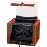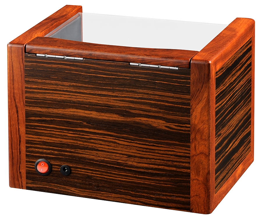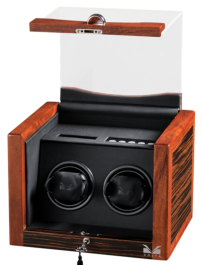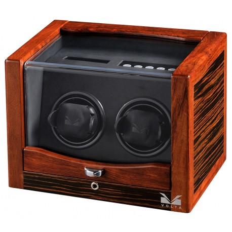 This Volta double watch winder 31-560022 features a rustic ebony/rosewood finish with a black leather interior. The inside portion of this winder is lit by a white LED light that beautifully showcases the watch that is mounted onto the winder. This winder can be locked using the supplied key to ensure the safety of your prized possessions. Each of the watch mounts is powered by its own high quality and ultra-quiet Japanese Mabuchi motor. To control the motor of the winder, you will find an LCD screen on the inside of the winder. Using the buttons to the right of the screen, you can control the revolution direction and the speed (TPD) of the winder. You are able to select a clockwise setting, a counterclockwise setting, or a combination of clockwise and counterclockwise revolutions. With this Volta winder, you are able to select a speed (TPD) setting of 650, 900, 1350, or 1800 revolutions, so you will definitely be able to find the right setting for your specific watch. Please check other double watch winders.