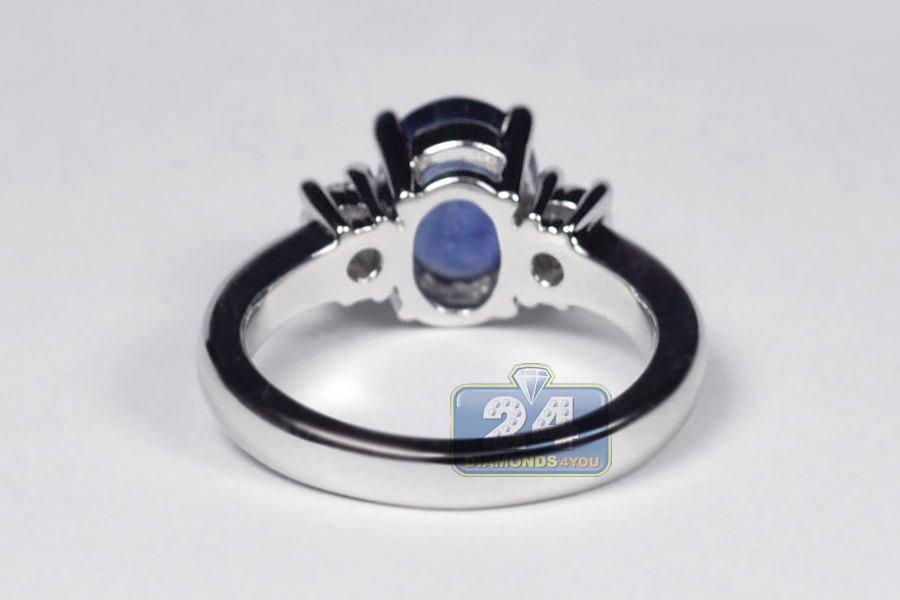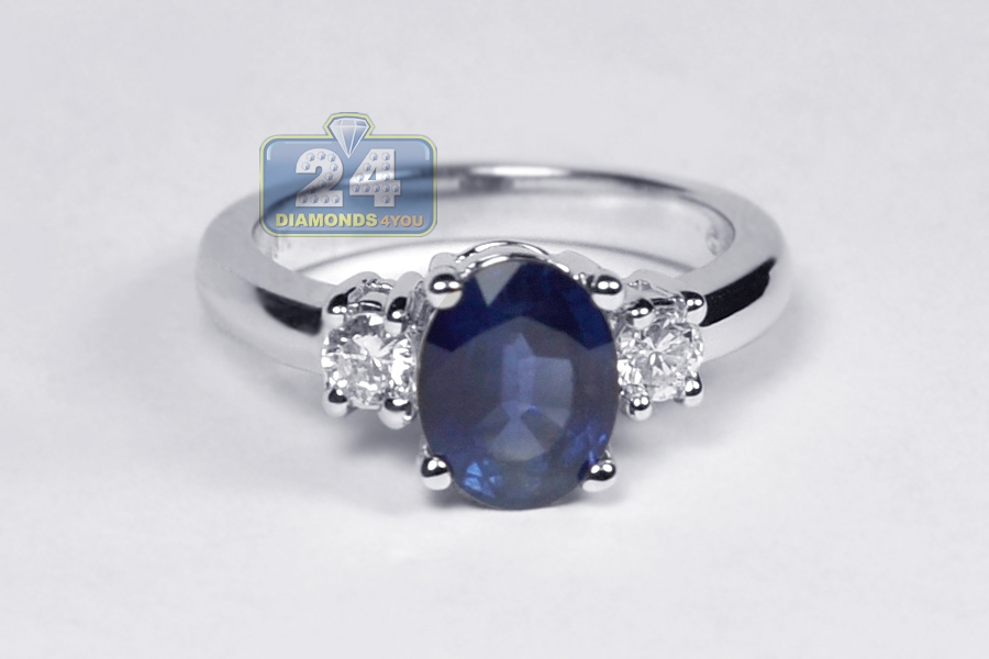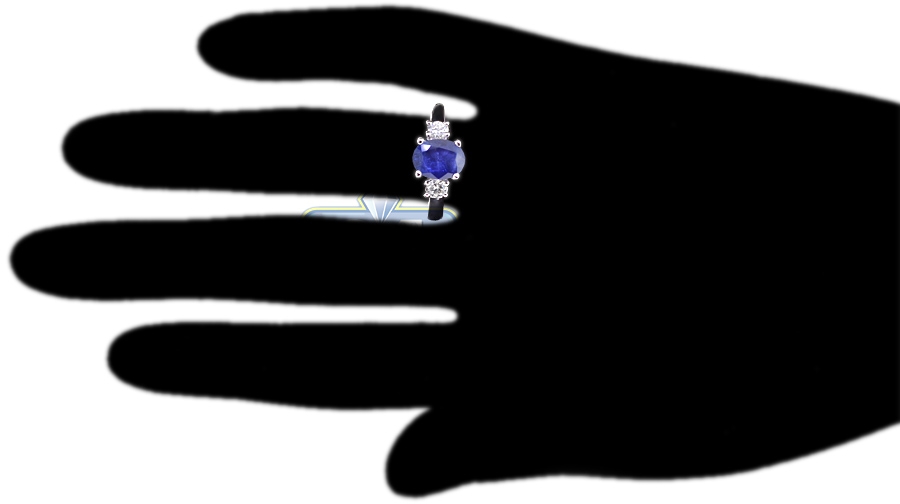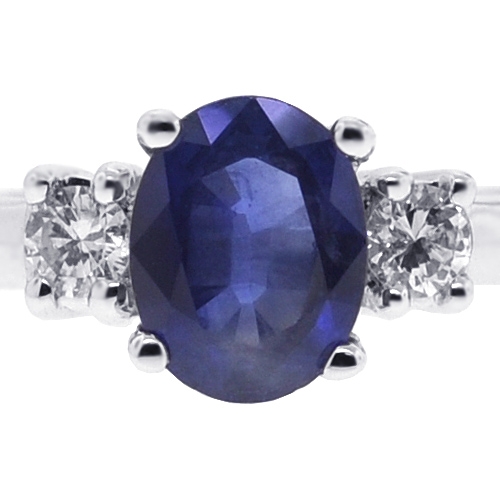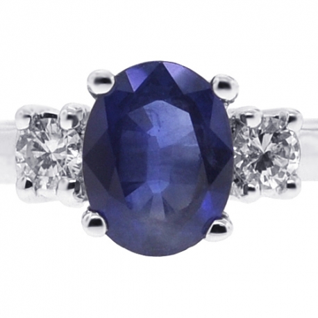 Enjoy play of colors wearing our fabulous diamond gemstone three stone ring that can be an ideal engagement ring or a piece for special events! It's professionally created from cool 18k white gold, and highly polished for very smooth sparkling finish. The central stone features oval-cut heated blue natural sapphire of 2.00 carats. There are two icy white round brilliant-cut diamonds (0.30 carat) on the sides. You'll catch yourself staring at this women's 3-stone ring all day long!