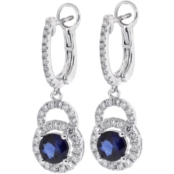 Show off your unique sense of style with this pair of gemstone diamond drop earrings. Professionally handmade of cool 18k white gold, they have highly polished smooth finish. They're encrusted with round-cut heated blue natural sapphires (1.93 carat) that surrounded by icy white round brilliant-cut diamonds (1.00 carat). The pair is secured with user-friendly omega closures. These lady's dangling earrings have simply stunning design!