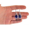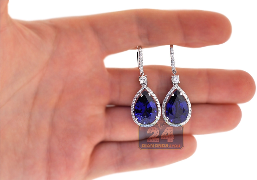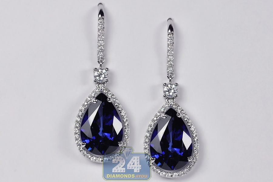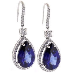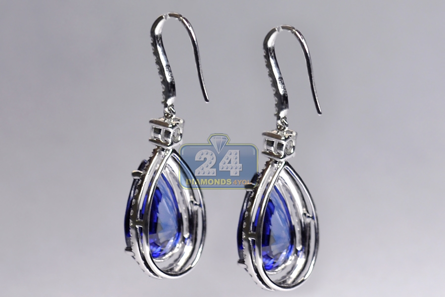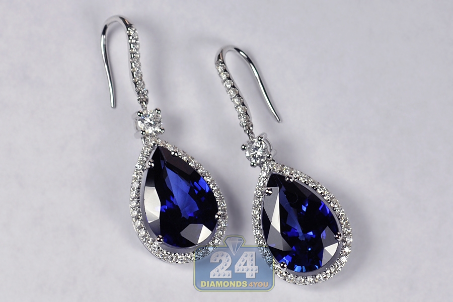 Our pair of diamond gemstone drop earrings is a breathtaking statement on elegance and beauty! They're lovely produced from cool 18k white gold, and highly polished for ultra-sparkling finish. They feature 2 pear-cut diffused blue genuine sapphires totaling 17.04 carats that highlighted by 1.22 carat of icy white round brilliant-cut diamonds. Fish hook clasp allows easily put the jewelry on/off. You'll be delighted with classic but contemporary design of these women's dangle earrings!