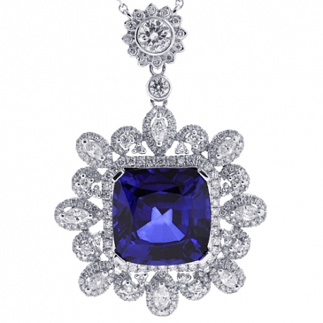 Our diamond gemstone pendant is the real definition of fabulous! It's artfully created from 18k white gold with highly polished shimmering finish. The center features cushion-cut diffused blue genuine sapphire weighting 16.02 carats. It's surrounded by 2.31 carats of icy white round brilliant-cut natural diamonds. The piece measures 16.5 inches in total length, and the pendant is 45 x 30 mm. It's also has a user-friendly lobster claw clasp. This women's sapphire necklace is an elegant display of illumination and brilliance!