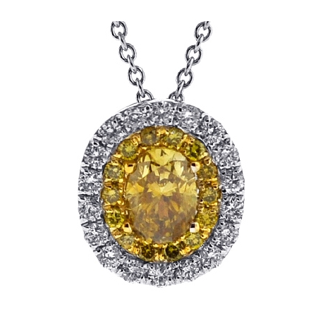 Our elegant diamond drop necklace just might be a lovely presentation of glamour! The pendant is masterly produced from cool 14k white gold, and amazed with oval brilliant-cut canary diamond in the center that surrounded by round brilliant-cut diamonds of white and canary colors, all totaling 1.02 carat. Canary stones are color-enhanced. The oval drop pendant measures 12 x 10 mm, and suspended from 16 inch chain. Heads will turn while wearing this women's cluster pendant! This necklace is a part of the set. Earrings and ring are also available.