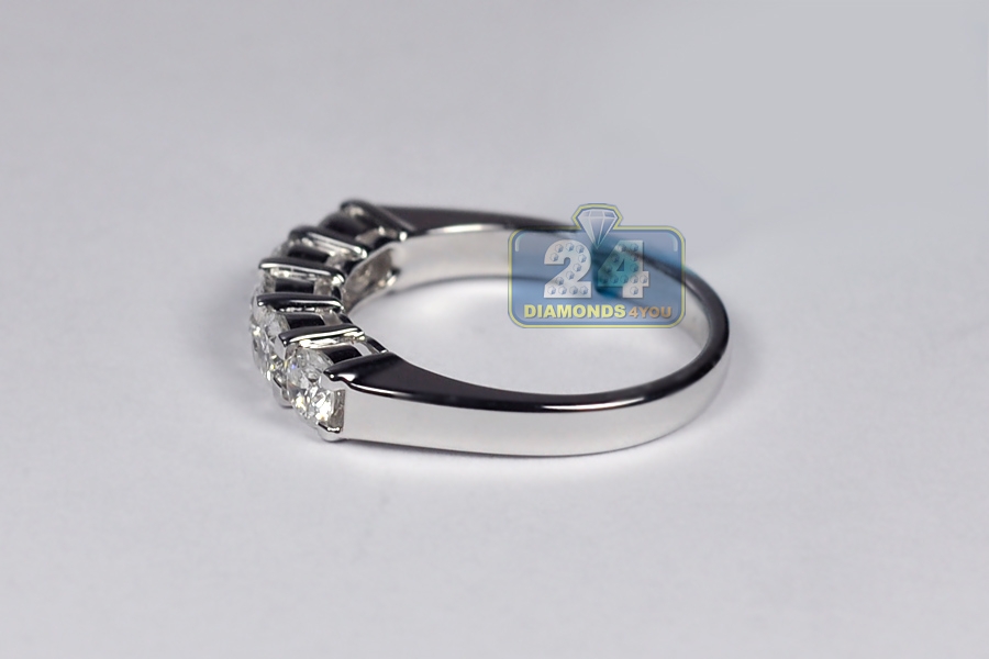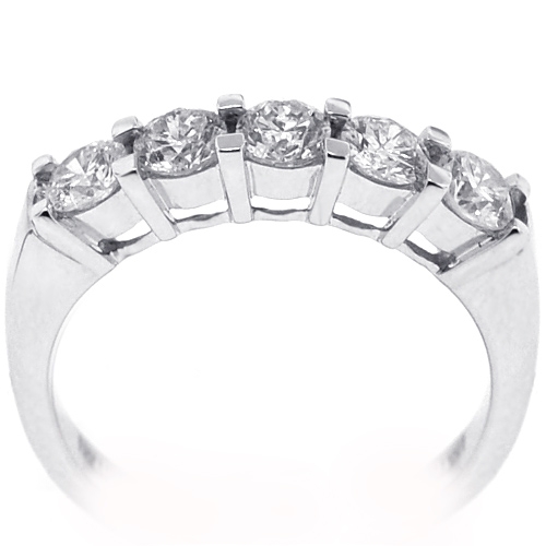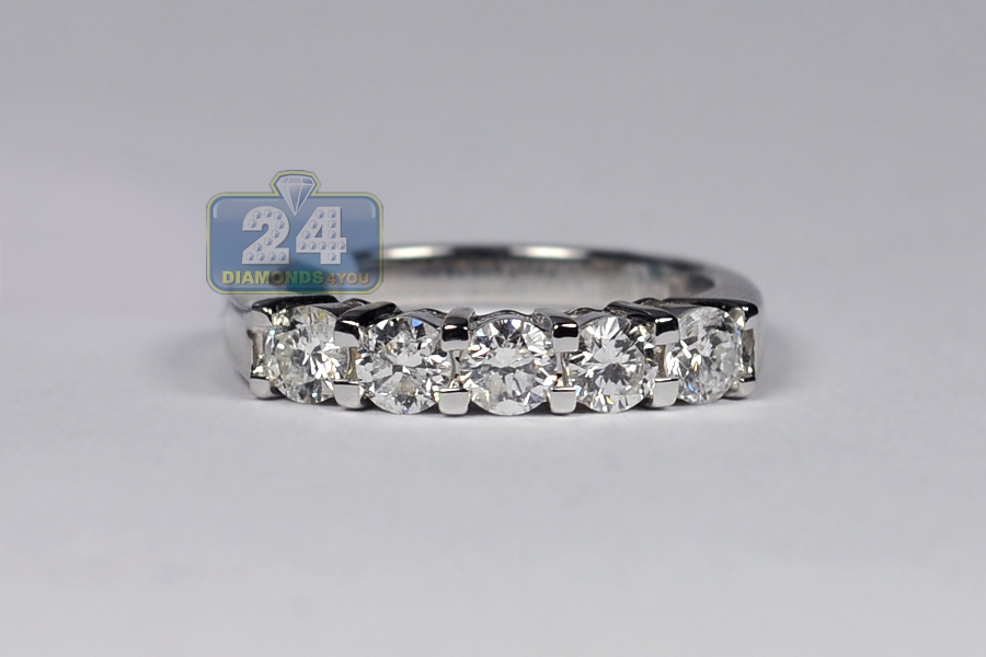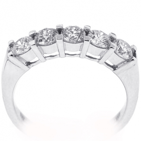 Light up your eyes with out elegant diamond 5-stone ring! It's masterly created from cool 18k white gold, and has high-polished shiny look. The piece is encrusted with 1.10 carat of icy white round brilliant-cut genuine diamonds. It measures 4 mm in width. This lady's anniversary ring is ready for any special occasion!