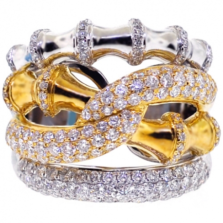 Capture everyone's attention with our impressive diamond bamboo ring! Artfully crafted in 18k gold of white and yellow tones, it is encrusted with icy white round brilliant-cut genuine diamonds totaling 1.89 carat. Bamboo motif of this lady's ring creates spectacular design!