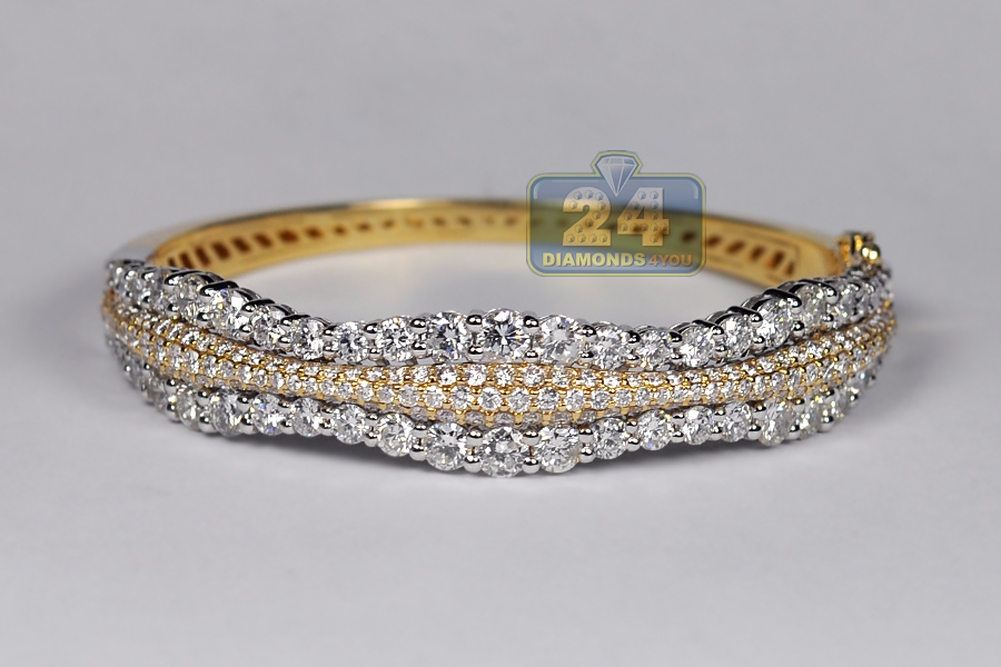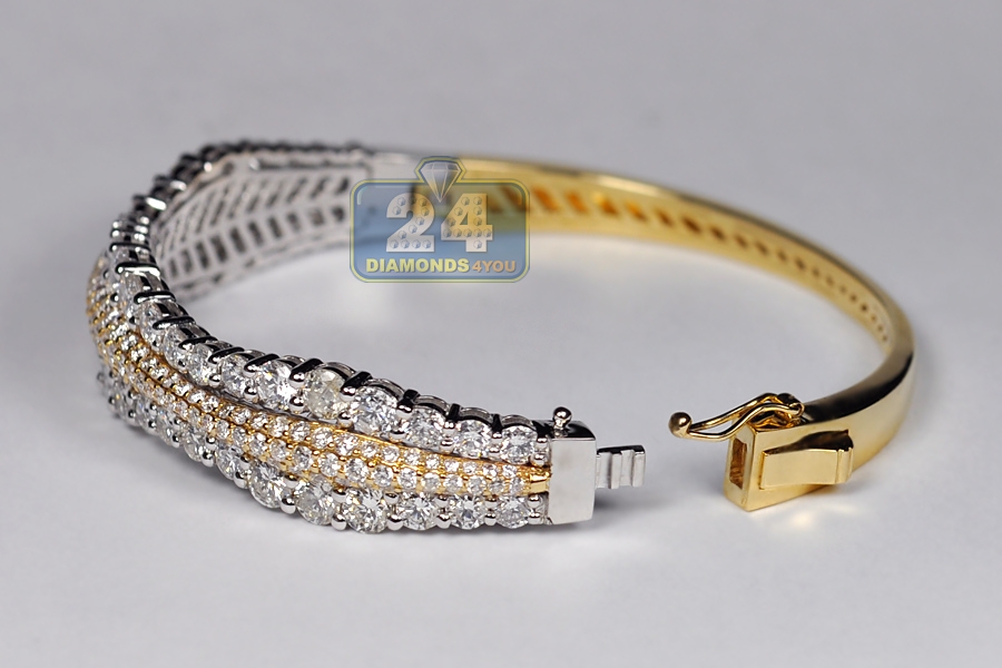 Our diamond bangle bracelet is a stunning example of luxury and elegance! It's artfully produced from 14k gold of white and yellow colors, and highly polished for ultra shimmering smooth touch. The piece of jewelry is studded with icy white round brilliant-cut natural diamonds totaling 10.13 carats. It measures 6.5 inches in inner length, and from 4 to 13 mm in width. With this women's wrist bracelet you're ready for a red carpet event!