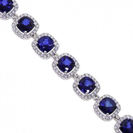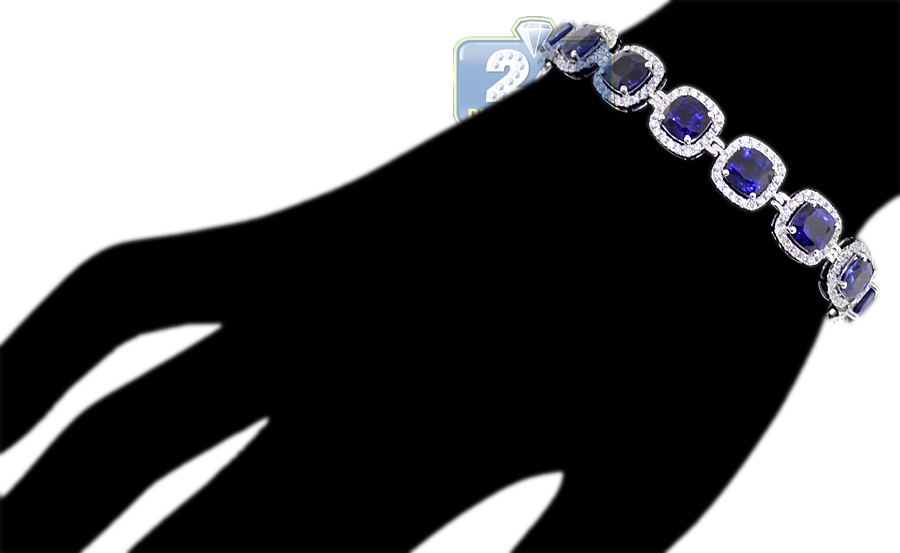 The halo design of our stunning diamond gemstone bracelet will take your breath away! It's professionally created from cool 18k white gold, and features high-polished smooth finish. It's amazed with cushion-shaped diffused blue natural sapphires of 26.33 carats. They're highlighted by icy white round brilliant-cut genuine diamonds, all totaling 2.75 carats. The piece measures 7 inches in length, 10 mm in width, and closed by a safe barrel clasp. This womens wrist bracelet is an amazing find for the sophisticated connoisseur!