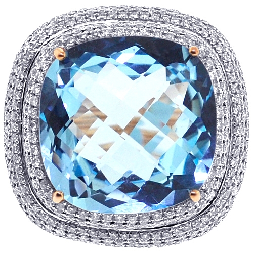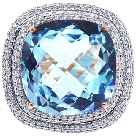If topaz is your favorite stone, this magnificent gemstone ring will be just perfect! Expertly crafted in warm 18k rose gold, it is amazed with huge cushion checkerboard-cut heated blue genuine topaz of 31.04 carats, and white round brilliant-cut diamonds of 1.71 carats. This lady's diamond cocktail ring makes an unforgettable impression!