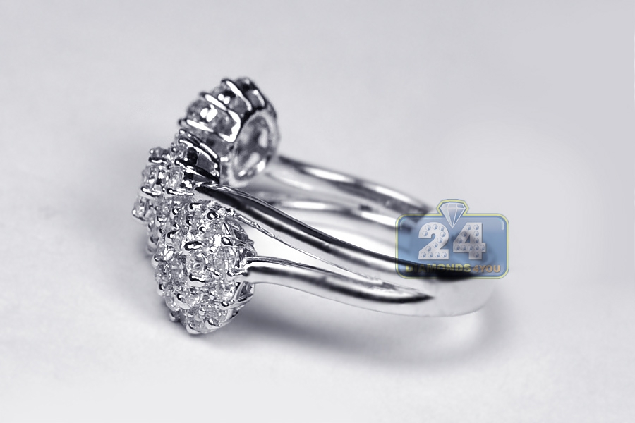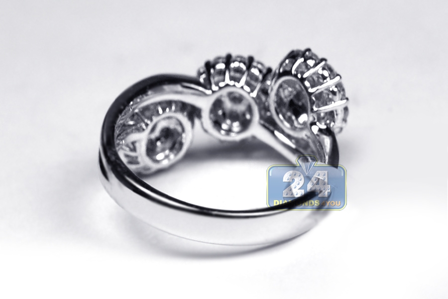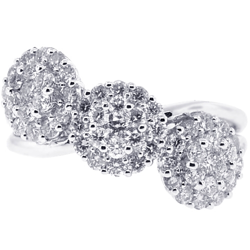 Breathtaking diamond clusters are haloed to make a unique illusion of a three stone ring! It's expertly created from cool 18k white gold, and polished for shiny smooth finish. The piece of jewelry has slant design that encrusted with icy white round brilliant-cut genuine diamonds, all totaling 1.24 carat. Catch the wave of elegance with this women's halo ring!