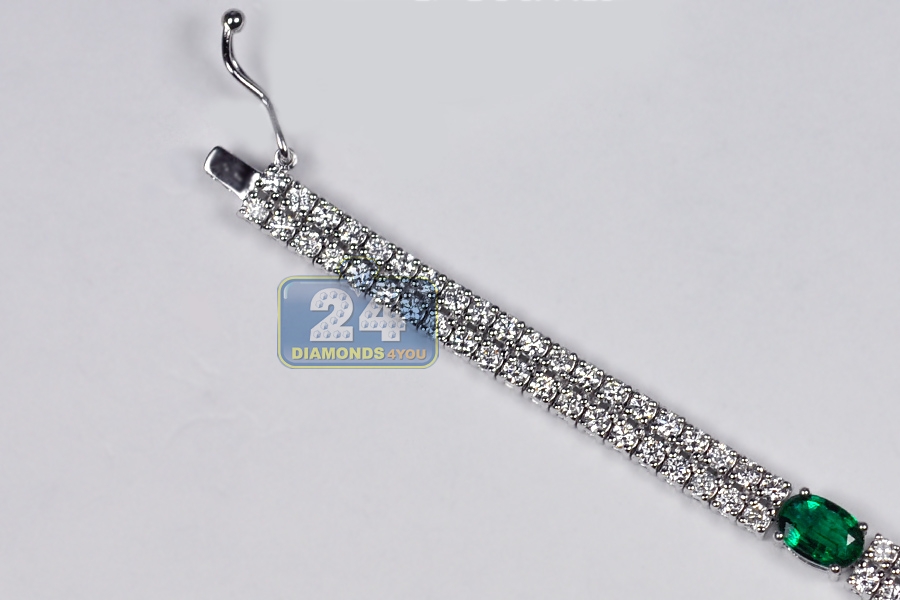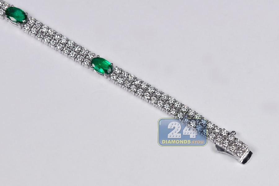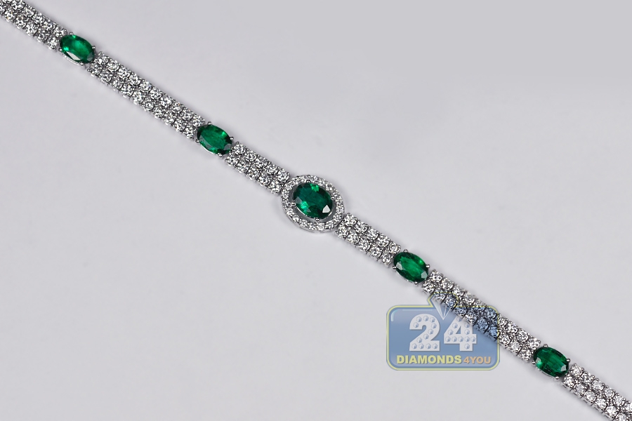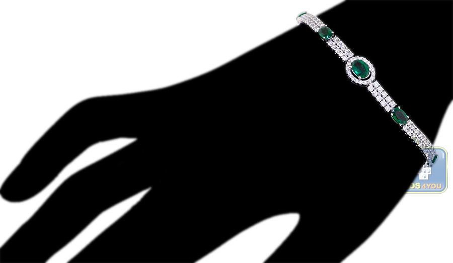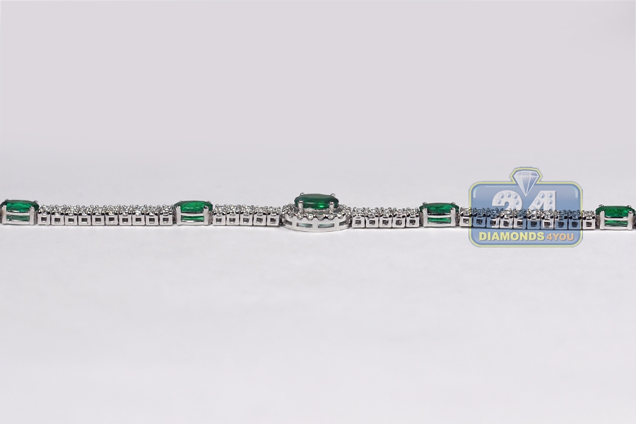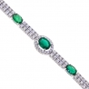Our striking diamond gemstone tennis bracelet is the essence of sheer luxury and opulence! Professionally made of cool 14k white gold, it's highly polished for smooth and shiny finish. It's set with 2.18 carats of green oval-cut genuine emeralds that highlighted by two rows of icy white round brilliant-cut diamonds, all weighting 2.80 carats. The piece of jewelry measures 7 inches in length and from 4 to 8 mm in width. It's also closed with secure box with latch clasp. Adorn your wrist with this women's timeless bracelet!