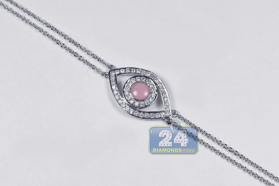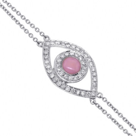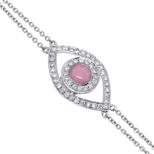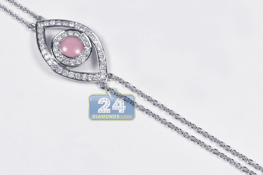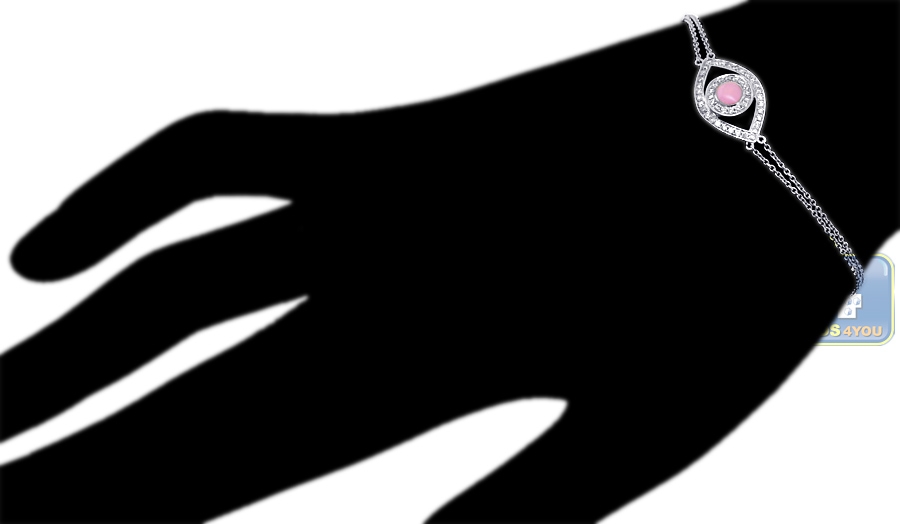 The ancient symbol of protection in a fresh look is presented by our diamond evil eye bracelet! It's masterly created from cool 14k white gold, and highly polished for shiny finish. The central link features pink enamel accent, and encrusted with 0.15 carat of white round brilliant-cut genuine diamonds. The piece measures 7 inches in length, and secured with a user-friendly lobster claw clasp. Wear this women's wrist bracelet for luck or just for the look!