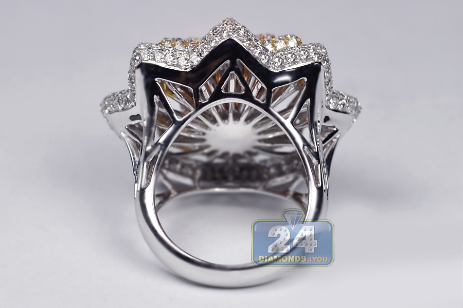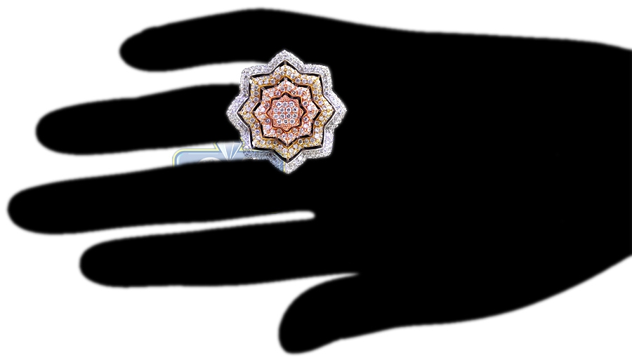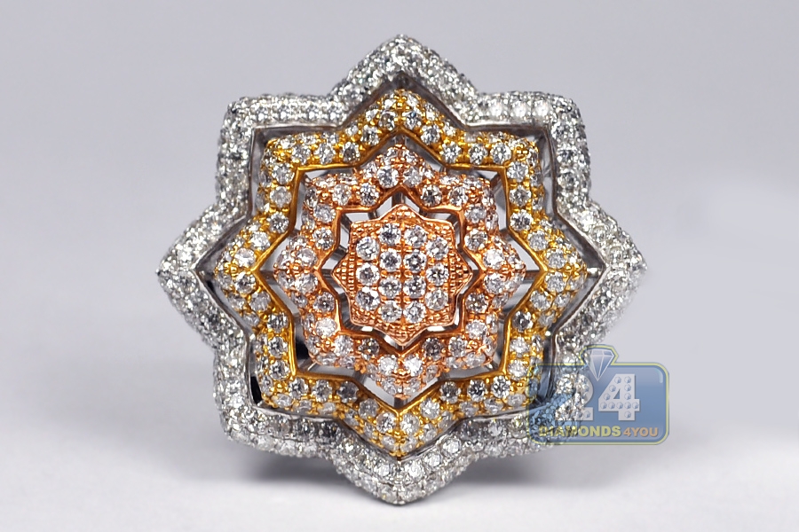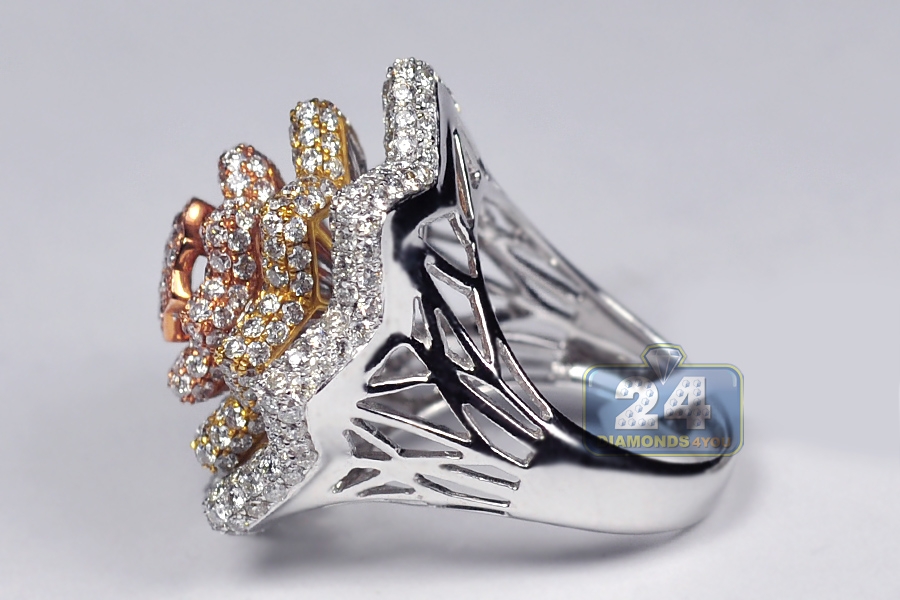 Complete your evening look with our truly gorgeous diamond flower ring! It's masterly handmade of 14k gold of white, rose and yellow colors; and features polished ultra smooth finish. It's also studded with icy white round brilliant-cut genuine diamonds, all totaling 5.16 carats. The top measures 30 mm in width and the shank - 4 mm. This women's large ring is a unique piece of jewelry that will catch everyone's eye!