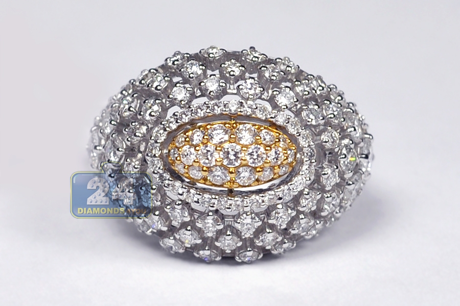 Chic and sensational, our diamond dome ring has interesting lattice design! It is masterly handmade of lustrous 18k gold of white and yellow colors; studded with 2.48 carats of icy white round brilliant-cut natural diamonds. Magnificent look of this women's fancy ring is totally on trend!