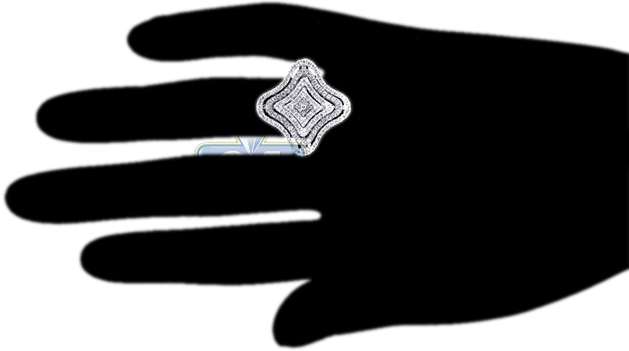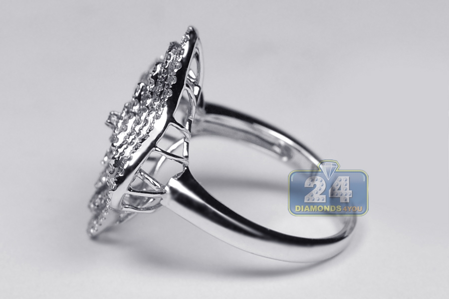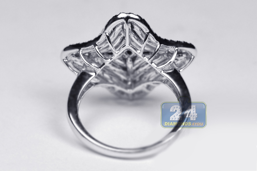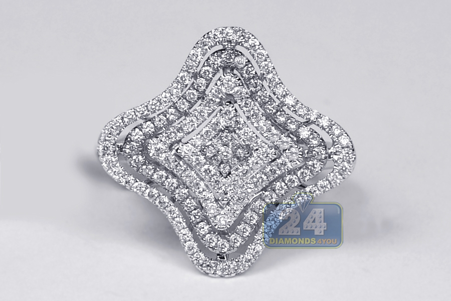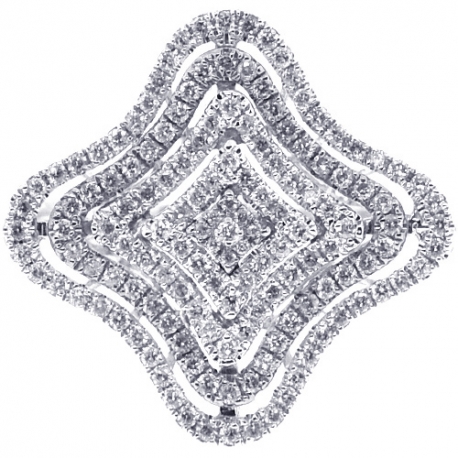 When you walk in wearing our lovely diamond ring designed in original layered flower style, every eye will be on you! Expertly produced from cool 14k white gold, it features highly polished sparkling finish. The top of the piece measures 23 mm in width, and set with 1.02 carat of icy white round brilliant-cut genuine diamonds. The shank is 2 mm. This women's floral ring is gleaming from every angle!
