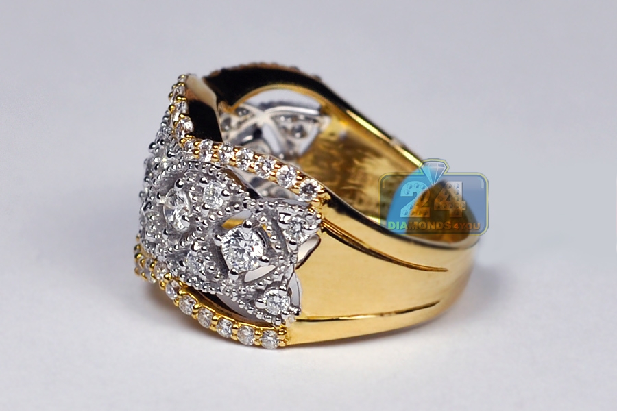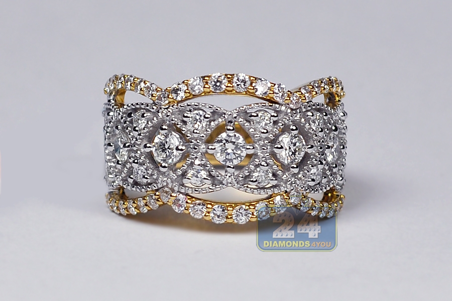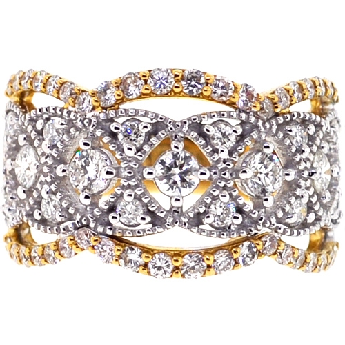 Express your unique taste for luxury with our elegant diamond openwork ring! It is ably created from 18k gold of yellow and white colors, and accented with 1.31 carat of icy white round brilliant-cut genuine diamonds. This lovely band is bound to put sparkle in lady's eyes!